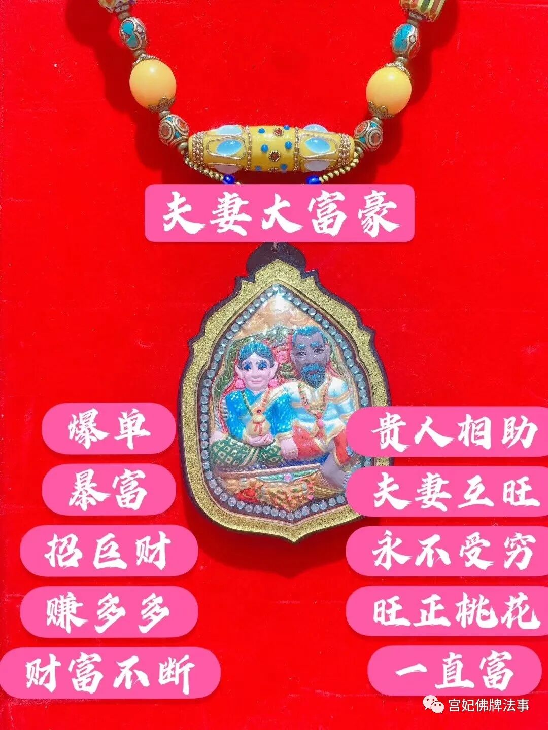 法相上刻了金银钱袋⛰️也是帮助佩戴者拥有无限财富人缘。走到哪都如鱼得水般得到贵人相助、大富豪夫妻被金山银山宝山所坐拥 ,背后镶入不同的密法经文符管以及鲁士、招财女神、金银扁单 和大富翁夫妻法相运财之神都不为过 ,恭请就等于拥有了无限财运和机遇 ,增加恭请者的正财以及偏财运 ,增加说服力以及人缘 ,走到哪都可以得到贵人相助 ,让大家都喜欢你也等于得到了无限求财的机遇 增加求财灵感 ,让你感受到与以往不同的一切