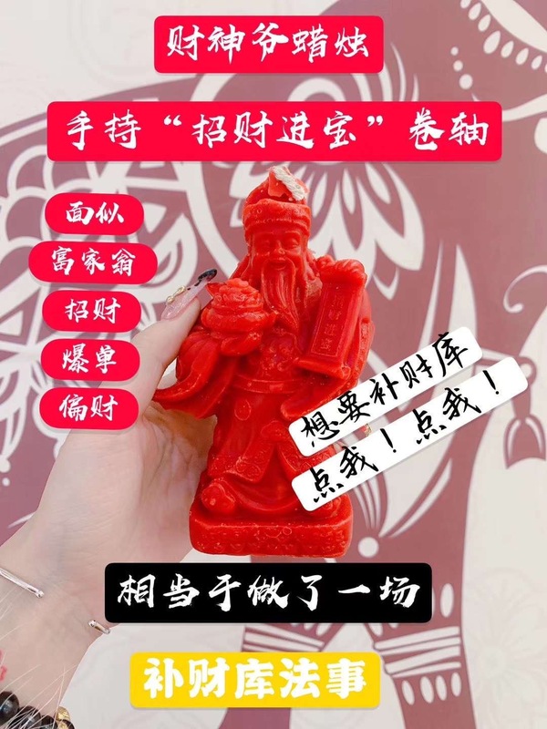 阿赞威帝 财神爷招财进宝蜡烛想要在新的一年过的顺风顺水,必点财神蜡烛!!!财帛星君他的外形很富态,是一个面白长髭的长者,身穿锦衣系玉带,左手捧着一只金元宝,右手拿着写上“招财进宝”的卷轴,面似富家翁。相传他是天上的太白星,属于金神,他在天上的职衔是“都天致富财帛星君”,专管天下的金银财帛。点燃此蜡烛能帮助带来好运,招揽正偏横财,填补财库,宛如财神在身边般让你生意事业一帆风顺,赚进无限财富,亦助引来人缘贵人,帮助提升生活品质等。点蜡烛质料【名字➕阳历生日】